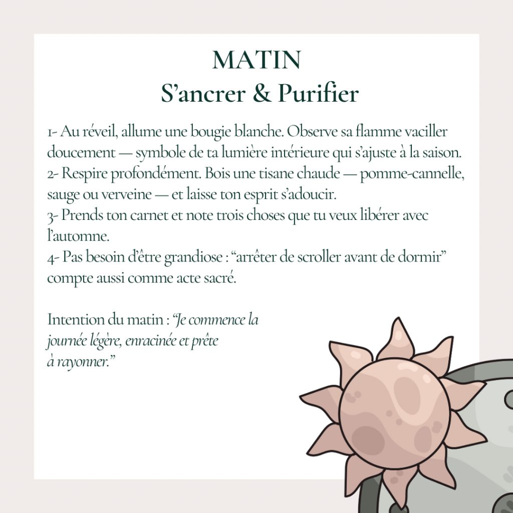 Voici comment tisser ta journée autour de cette énergie d’équilibre, de gratitude et de douceur.