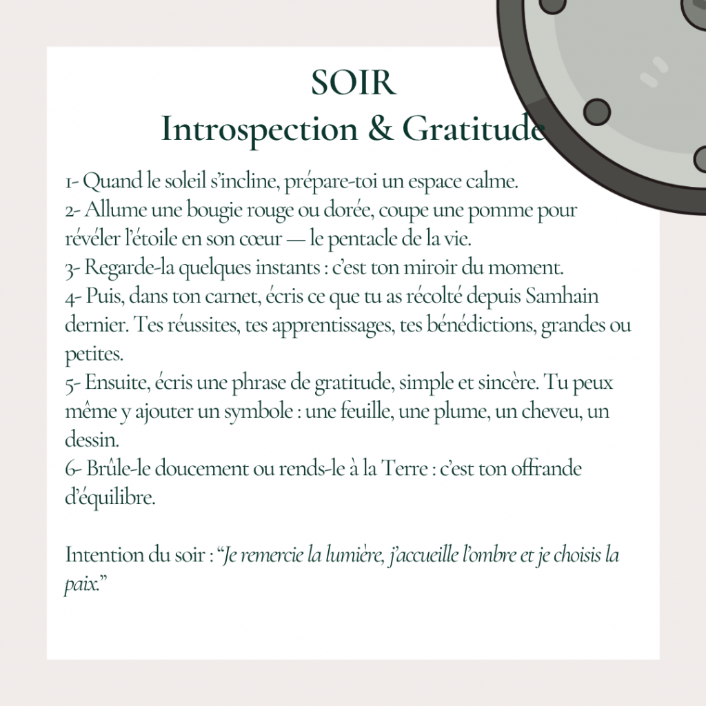 Pour clôturer la saison, crée ton propre cercle sacré : Allume une bougie blanche (purification) et une dorée (abondance). Coupe une pomme, écris ce que tu veux laisser partir, rends-le à la Terre. Tiens une feuille de chêne pour la force, un fruit pour la gratitude, et un silence pour l’équilibre.“Je suis la lumière et l’ombre, la récolte et la graine,