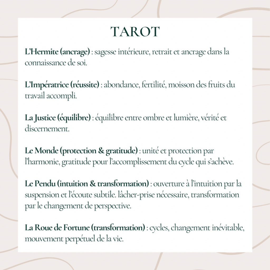 Cartes possibles : L’Hermite (sagesse intérieure), La Justice (équilibre), 6 de Bâtons (affirmation et direction).