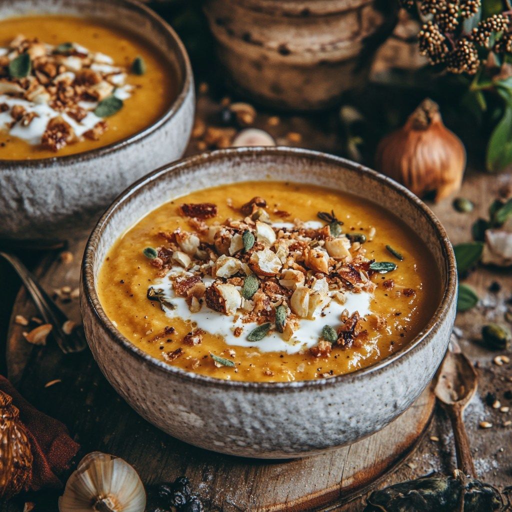 Velouté de courge & carotte, éclats de noisette